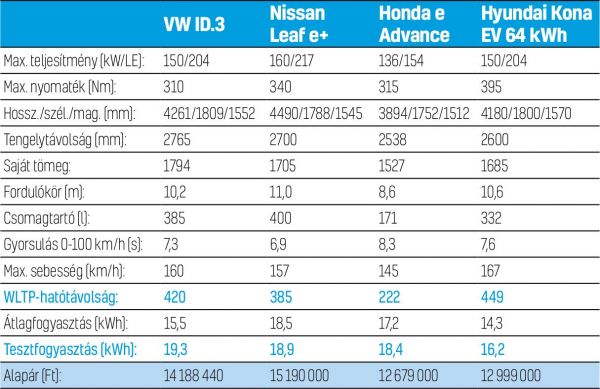 Kevés gyártó rendelkezik akkora tapasztalattal a villanyautó-gyártásról, mint a Nissan: a Leaf sokáig Európa legnépszerűbb elektromos modellje volt, és bizony a nyers adatok is alátámasztják, hogy a VW vagy a Honda viszonylatában konzervatív megjelenés figyelemre méltó technikát takar. A tesztre fogott, 62 kWh-s változat a kisebb, 40 kWh-s Leaffel szemben 100 kW-tal is tölthető, de ami fontosabb, hogy kedvezőtlen körülmények között is a gyári, WLTP-átlaghoz hasonló értékeket produkál: hatótávolsága minimálissal marad el a 300 kilométertől. A Leaf az egypedálos vezetést lehetővé tevő e-Pedalt is felvonultatja, ugyanakkor a kvartettből ez az egyetlen, amelynek távolból nem temperálható a telepcsomagja, vagyis elméletben, ha hideg akkunál kezdjük villámtölteni, lassabban veheti fel az áramot.