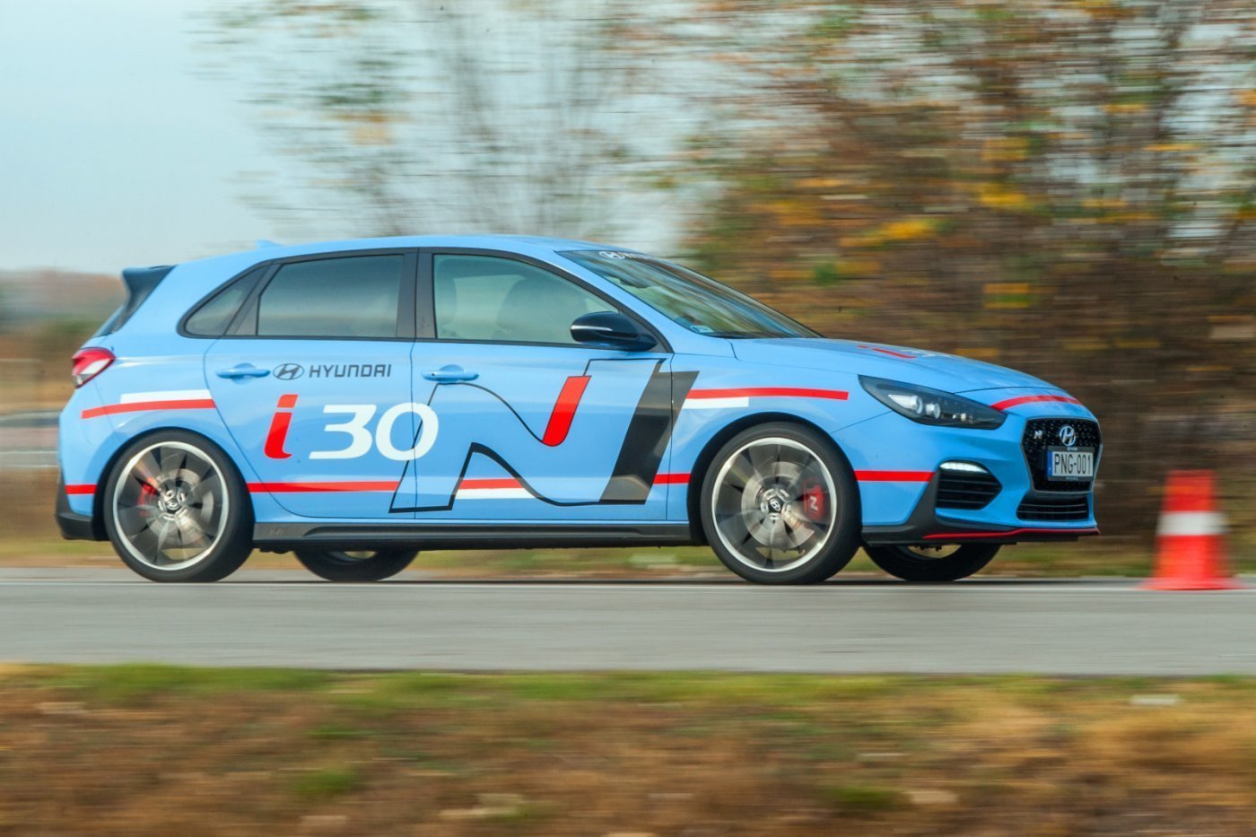 Apró makula volt a tesztprogramban, hogy mi már téli abronccsal kaptuk meg az i30 N-t, ami 20 °C feletti nappali hőmérséklet mellett rosszul tapadt. A 0-100 km/órás gyorsulás inkább füstbe ment, mint előre, és N-módban egy-egy komolyabb gázadásra is csak kipörgő kerék volt a válasz gyorsulás helyett. Azt azonban érezni lehetett, hogy többre hivatott ez az autó, pontosan irányítható, jól adagolhatók és hatásosan lassítanak a fékek, és ahogy az a forró ferdehátúak között lenni szokott, könnyen táncba vihető a hátsó tengely. Külön gombot kapott a kormányon az N-mód, amikor engedékenyebb lesz az elektronika, érzékenyebb a gázpedál és hangosabbra kapcsol a kipufogó – legalább valami képes elnyomni a téli abroncsok gördülési zaját… –, de sajnos a felfüggesztés is bekeményít. Utóbbi már túl sok a magyar utakon, ha ugyanis nem tükörsima az aszfalt, nagyon ráz az autó, kanyarban pedig még az ívről is lepattog. Normál módban egyébként a körülményekhez, vagyis a peres abroncsokhoz képest egész jó a rugózás; a 25 ezer kilométerénél járó tesztautó meglepően egyben volt, semmi nyikorgás nem hallatszott, ami dicséretre méltó teljesítmény egy ilyen, feszes hangolású, rövid idő alatt sokak által nyüstölt kompakttól. A váltó is jól átvészelte a megpróbáltatásokat, pontosan megvezetett, rövid utakon jár a kar, az egyik legjobb része az autónak. Nem tetszett, hogy a vezeték nélküli töltő (35 000 Ft) egyfelől nem tartja megfelelően a készüléket, másfelől használata lefagyasztotta a telefont. Ezzel ellentétben az első kagylóülések igenis szorosan tartják a testet. Az ülőlap kemény oldaltámaszai a hozzám hasonló alkatú embereknek fájdalmassá teszik a több száz km-es túrákat, de a vetélytársaktól eltérően kellően alacsonyra építették be ezeket, ami piros pontot érdemel.