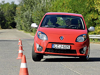 Aggodalomra semmi ok, a megengedett 130 km/óráig betyárosan rohanunk előre, ám az talán meglepőbb – nemcsak nekünk, hanem a forgalom többi résztvevőjének is –, hogy még innen is meglódul a GT. Autópályán sem diszharmonikus a Twingo, kicsit furcsa egy miniről azt mondani, hogy kellemes utazóautó, márpedig a GT ilyen. Az ülésekbe jó belehuppanni, elöl tágas az utaskabin, a széria sebességszabályozó pedig hosszú távon fokozza a kényelmet. A maximális 145 Nm-es nyomaték már 3000-nél kicsúcsosodik, a százas sprintet 9,8 másodperc alatt teljesíti a mindössze 980 kilós autó, melynek végsebessége is elismerésre méltó (189 km/h). Ötfokozatú váltója jóval pontosabb, mint a gyengébb változatokban található egységek. Vezetése rendkívül jó móka, de akad egy-két részlet, ami nem illik egy GT-hez. Kifejezetten orrnehéz a kocsi, a futómű nem valami feszes, nagyon hiányzik az ESP, nedves útfelületen pedig a kipörgésgátló. Érthetetlen, hogy miért nem lehet legalább felárért elektronikus menetstabilizálót vásárolni!? A GT felszereltsége mindezek dacára bőséges, ehhez a szinthez 15-ös könnyűfém felni, ezüstszínű hátsó szárny és tükör, kormányról vezérelhető CD-rádió és esőérzékelős ablaktörlő is dukál.