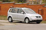 Ami a Volkswagen Touran formavilágát illeti, abba nem sok szellemes vonás szorult, inkább a németesen feszes stílust követi. Ugyanakkor az utastérben valódi ötletbörze kezdődik: például az első ülések támlájának hátuljáról reggeliző asztal hajtható fel. Azután a második, három egyenrangú székből álló üléssor sínen csúsztatható előre-hátra, támlájukat előrebuktathatjuk (a középső ülés így könyöklőként és asztalként egyaránt funkcionálhat), továbbá össze is hajtogathatjuk, s szükség esetén kiszerelhetjük őket. Felár ellenében további két ülőalkalmatosságot rendelhetünk, melyek – használaton kívül – az Opel Zafiráéhoz hasonló módon a padlóba hajtogathatók. Hárompontos biztonsági öv és fejtámla mindenhová jutott, de hátulra lehetőség szerint csak gyerekeket ültessünk, mivel oda körülményes bemászni, meg aztán itt már a helykínálatot sem felnőttekre méretezték. Aki a Touranban nem tudja elhelyezni apróbb holmijait, annak sokkal inkább utánfutó javasolható. A tervezők ugyanis nem kevesebb, mint 39 pakolórekeszt álmodtak az autóba – találunk légkondicionáló által hűtött dobozt, 12 voltos csatlakozókat, napszemüveg-tárolót, kartámaszt elöl, valamint kisebb-nagyobb üdítők számára italtartót. Hétszemélyes “üzemmódban” meglehetősen szűkös a poggyásztér, ám öt üléssel már 695, kettővel pedig 1913 ill. 1989 liternyi csomagot képes elnyelni (attól függően, hogy megrendeltük-e a pótszékeket). A könnyen kezelhető és esztétikus csomagtérroló a hátsó és a középső üléssor mögé is felszerelhető, ha pedig nincs rá szükség, a csomagtérpadló alatt húzódó rekeszben tárolhatjuk. Hatalmas raktérnyílás és alacsony küszöb segíti a pakolást, ám a két fokozatban állítható ötödik ajtó kissé alacsonyra nyílik, bár kézzel még feljebb lehet tornászni.