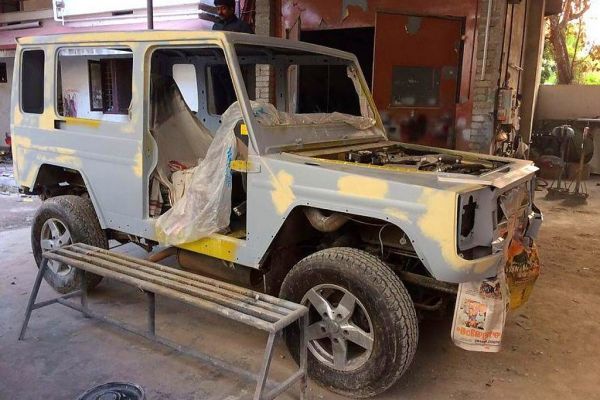 A karosszéria elején elfért a gyári hűtőrács- és fényszóró burkolat, de az indiai autón hátrafelé erősen emelkedik a tető vonala és függőleges a hátfala, míg az osztrák eredetinél enyhén előredöntik a hátsó szélvédőt. Utóbbiakat is végrehajtották, és ekkor már befalazták a hátsó ajtó melletti ablakokat is. Ahhoz, hogy a Mercedes kerékjárat-szélesítéseket fel lehessen szerelni, módosították a kerékjáratok peremeit is.