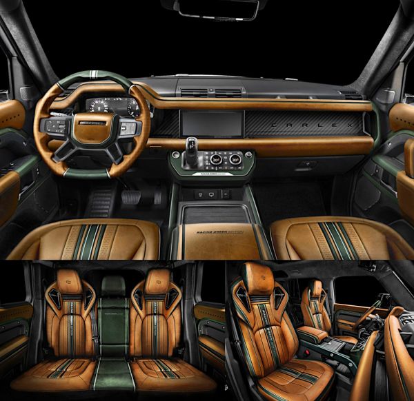 Az utastérben átformált üléstámlát kapnak az első ülések és a második üléssor, a szélső üléseket és a műszerfalat barna bőrrel vonják be, ezenkívül még zöld bőrt is használnak. A tetőkárpitot fekete Alcantarára cserélik, és itt is megjelenik több helyen a szálhúzott zöld fényezés. Azt nem árulták el, hány darabra korlátozzák a British Racing Green nevű limitált szériát, csak azt, hogy a sorszámot tartalmazó plakettet a műszerfalra teszik. Az első számítógépes grafikákon a legalább 85 000 euróba kerülő Defender 110-es látható, de a Defender 90-esből is megépítik a különleges modellt.
