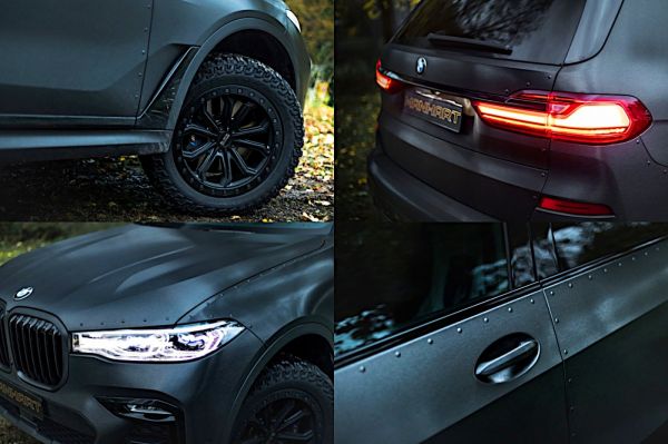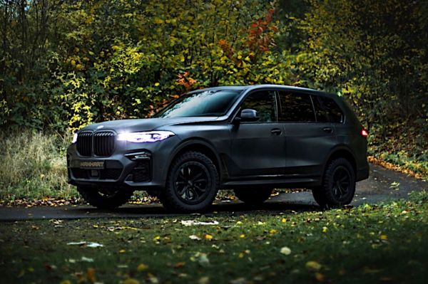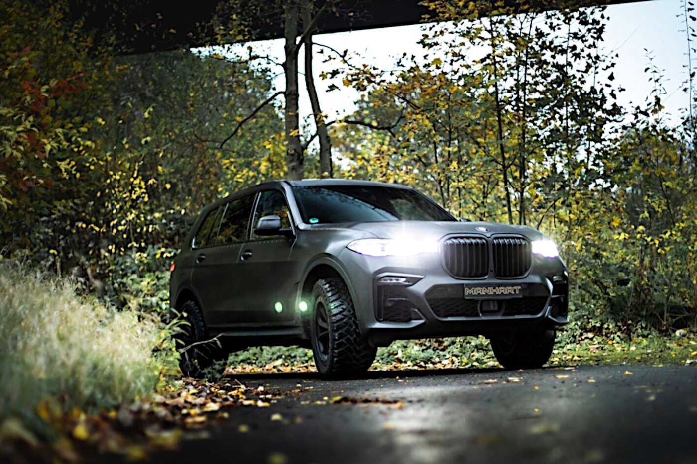 A Manhart tuningcég megítélése szerint a BMW X7-es gyári állapotában nem alkalmas arra, hogy mindenhova eljusson, és rögtön szállítja is a megoldást. A hasmagasságot 40 mm-rel emelik meg a légrugózás átprogramozásával, így a kerékjáratokban már kényelmesen elférnek a 10×20 col méretű Black Rhino felnikre szerelt 305/50 méretű Maxxis Bighorn MT-764-es terepgumik.