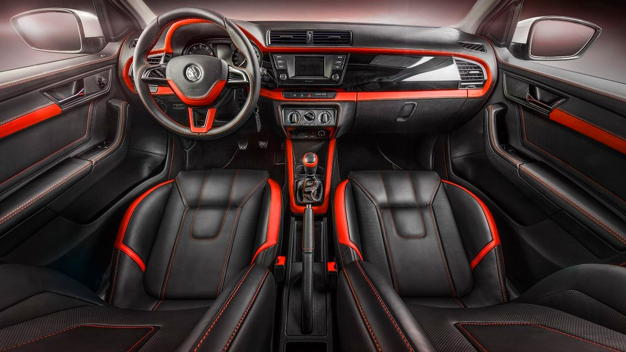 A lengyel Carlex Design alakította át gyökeresen a Škoda Fabia belső terét – a gyár is tisztában van azzal, hogy nem ártana feldobni valamivel a megjelenést, ezért lehet a tulajdonos által beküldött fényképet megjeleníteni az anyósülés előtti díszbetéten –, prémiumautókat megszégyenítő mennyiségben alkalmazva a bőrt.