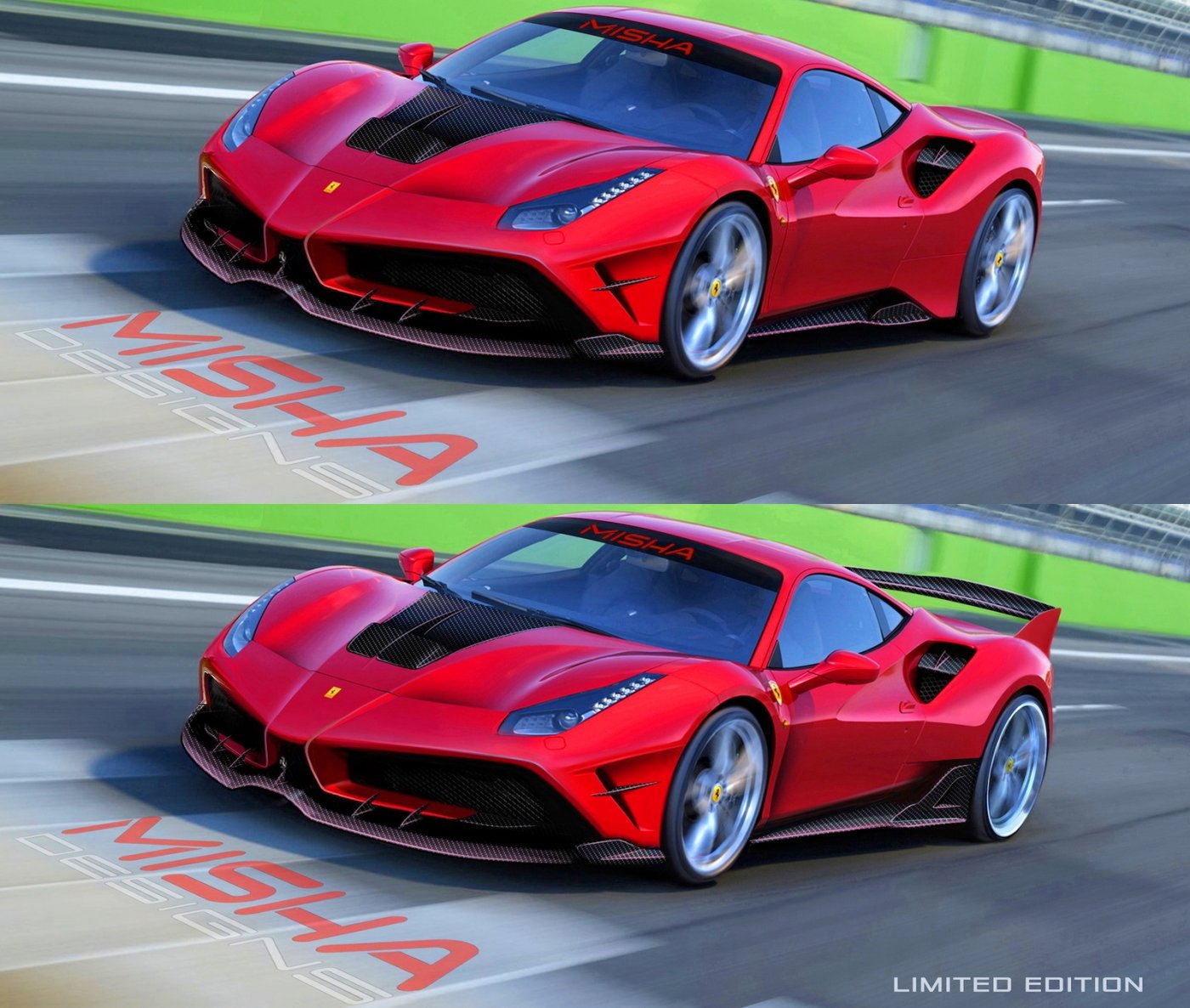 Jóval a Ferrari 458 gyártásának befejezését követően, 2015 novemberében mutatta be a Los Angeles-i Misha Designs nevű tuningcég a karosszériaátalakító készletét, amelynél a többi termékükkel ellentétben nem egyszerűen rátétekkel módosítják a megjelenést, de teljesen új karosszériaelemeket készítettek azok helyére.