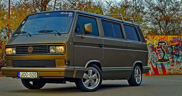 6×15 colos polírozott Fuchs replika felnik a VW buszon, színezett üvegek és spoilerszett teszi vonzóvá a VW T3-ast