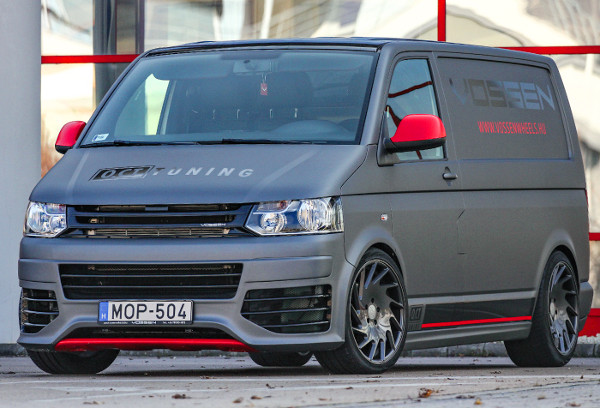 Nem is olyan rég még matt piros színben, a hozzáillő versenybringával parádézott az O.CT-féle VW T5-ös, azóta viszont eltelt egy kis idő, így a trendeknek megfelelően nem maradhatott akkori öltözékében. Az egykor még fehér, de máig 2.0 CR TDI motoros kisteherautóról lenyúzták a matt piros gúnyát, és matt szürkére cserélték. Kivéve a tükrökön, ahol a piros jó kontrasztot teremt a szürkével, valamint az egyedi lökhárító középső koptatója is piros maradt. A rácsokat fényes feketére fújták, köztük a jelvény nélküli hűtőmaszkot is, amely most a Vossen felnimárkát hirdeti.