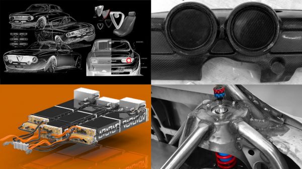 Nem egyszerűen csak felújítják és akkumulátoros-elektromos hajtásúvá építi át a Totem Automobili az Alfa Romeo Giulia GT Junior kupét, a nemrég alapított műhely még a formát is módosítja. Tömör alumíniumtömbből esztergálják az új pajzsot a kocsi orrára, a C oszlop vonalát is módosítják a hátsó oldalablakokkal együtt, és természetesen körben LED-es világítást használnak. A karosszériaelemek karbonból készülnek, a műszerfalat pedig két darab, digitális kijelzőre cserélik.