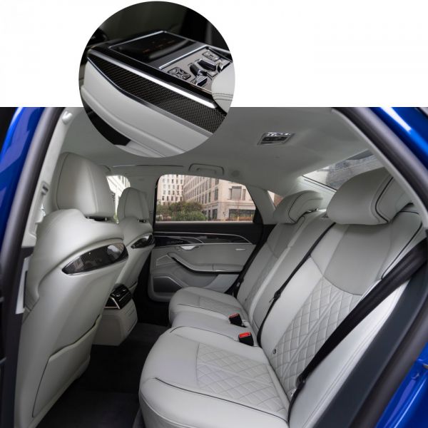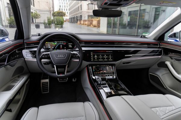 Az S8-as nem csak külsejét tekintve különbözik fő vetélytársaitól, a beltérnek is megvan a sajátos hangulata. Itt is érződik a „kevesebb néha több” filozófia, egy túlzásoktól mentes, kissé minimalista stílusú környezet fogadja a vezetőt és utasait. Az ergonómia hibátlan, az ülések tényleg eszményi kényelmesek, de leginkább a részleteket figyelve érti meg az ember, hogy egy topmodellben ül. A karbonmintás betétek, a dombornyomott quattro felirat vagy a gyújtásra előbújó szellőzőrostélyok igazán exkluzívvá teszik az S8-ast – talán csak a hátsó lábtér tekintetében számítottam többre. Az új, 10,1 colos kijelzőkön a hátul ülő utasok menet közben is nézhetnek filmet, ha pedig masszázst szeretnének, csak egy gombnyomás és máris kezdődhet a frissítő kúra. Mivel szélzaj és motorzaj alig jut be a kabinba, igazi süketszobában érezhetjük magunkat, ha nem szól a rádió, még a légy zümmögését is lehet hallani.