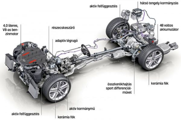 A német luxusautó-trióból még mindig az Audi a leginkább decens, ami ez esetben abszolút dicséret, hiszen egy túlzásoktól mentes, ízléses autóról van szó. Aki pedig kicsit is műkedvelő, az tudja, hogy az autó farán lévő S8 típusfelirat valami nagyon különlegest jelent. A VW-csoportnál széles körben alkalmazott 4,0 literes, V8-as benzinmotort használja az Audi toplimuzinja, 571 lóerős csúcsteljesítményéhez 800 Nm-es nyomaték társul. Mégsem a nyers adatok az érdekesek, hanem a technikai részletek: a két turbóval lélegeztetett V8-ast hengerlekapcsolással és részecskeszűrővel látták el, illetve 48 voltos rendszer is emeli a színvonalat. A 48 voltos rásegítés miatt a start-stop rendszer észrevétlenül működik, a nagy benzines úgy indul be, hogy abból szó szerint semmit sem érez a vezető.