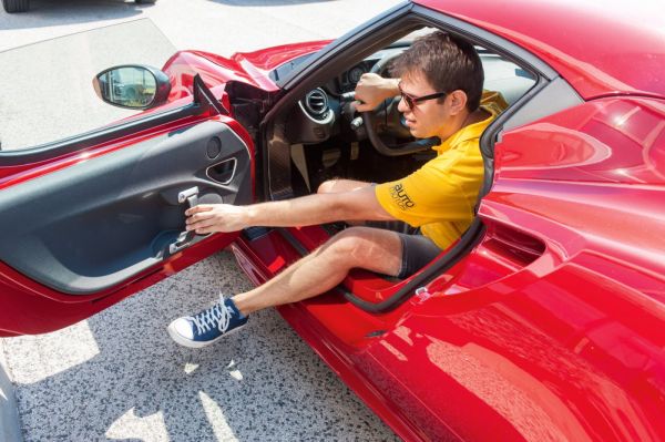 Mint a legtöbb komoly sportautó, a 4C is először a kompromisszumokkal szembesít. Egy kicsi ajtón és egy óriási küszöbön átkúszva ülhetünk be a mélyre beépített sportülésekbe. Puritán utasterében a tágasság ismeretlen fogalom, aki extra fejtérre vágyik, megtalálja a Spiderben, különben csak fokozza a hangulatot az ajtók és az oszlopok közelsége. Jól tartanak a kemény sportülések, éppen ilyen kicsi sportkormányra vágyunk, a két fémpedál és a jól látható karbonváz pedig versenyautós hangulatot garantál. Igen, pedálból csak kettő van, mert bármennyire és vezetőközpontú a kis Alfa Romeo, ebben is automatikus (duplakuplungos) váltó van, mint a legtöbb modern sportkocsiban. Indulásnál a Ferrarikéhoz hasonló procedúrát kell követnünk. A motor beindítása után az 1-es gombbal bírhatjuk mozgásra, az A/M gombbal pedig a nekünk tetsző funkciót kiválasztva bízhatjuk rá a kapcsolgatást vagy vehetjük át az irányítást a kormány mögötti váltófülekkel. Ezenkívül a más Alfákból is ismert DNA üzemmódválasztó kapcsolóval szólhatunk bele a működésébe. A 4C-be a Dynamic, a Natural és az All Weather állás mellett egy Race, vagyis „verseny” mód is került.