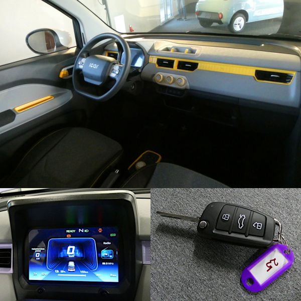 A pedálokon a + és a – jelzés látható, a haladási irányt az első ülések közötti forgókapcsolóval lehet kiválasztani, emellett van a 2 ablakemelő kapcsolója is, a szellőzést 3 tekerővel lehet vezérelni, a rádiót pedig a kormány 2 küllőjéről. Csapnivaló konstrukció a beépített rádió, hiszen a bal küllőn a frekvenciát lehet módosítani 1 tizedes ugrásokban, illetve hosszabb nyomás után automatikusan elmegy a következő elég erős rádióadóig, a jobb oldalon a hangerőt lehet állítani, és ennyi; memóriafunkció már nincs. Van a fedélzeten légkondicionáló, blokkolásgátló, légzsák, tolatókamera és -radar. A raktér megközelítéséhez a műszerfalon, a kormánytól balra elhelyezett kapcsolót kell megnyomni, a hátsó ajtón nincs kilincs, a nyílás csak az ajtó felemelésére szolgál. Magas a rakodóperem, az ajtó nem megy fel valami magasra, 1,7 méteres magasság mellett már vigyázni kell az éles sarkokra. A szűk keresztmetszetet legyőzve tényleg meglepően tágas a raktér, hivatalosan 1150 mm széles, 900 mm hosszú és 700 mm magas, a terhelhetőség 350 kg. A Cenntro Avantier C ára 11 500 euró + ÁFA, a forgalmazó napi árfolyamon számol Ft-összeget.