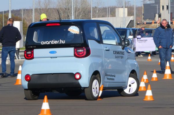 Egészen pontosan egy kis lépést jelent az Avantier C nevű autócska, hiszen az saját bevallásuk szerint valahol a mopedautók és személyautók közötti mezsgyén mozog – az EU hivatalos besorolása szerint L7e, tehát mopedautó. Kétszínű a fényezés, a pasztellszínek miatt vidám a megjelenés, a karosszéria furcsa arányai betudhatóak annak, hogy csak 12 colosak a felnik – van ugyan 145/70 R12 méretben téli abroncs, de válogatni már nem lehet –, a hossz nem éri el a 3, a szélesség a 1,5 métert, és ehhez 1,64 méteres magasság tartozik. A túlnyomórészt műanyag lemezek alatt egyébként klasszikus felépítéssel találkozunk, elöl MacPherson rugóstagos a felfüggesztés, hátul merevtengelyt használnak, a hajtómotor csúcsteljesítménye 30 LE, nyomatéka 85 Nm, így könnyen mozog a mindössze 724 kg tömegű csöppség. A lítium-vas-foszfát akkumulátor 14 kWh kapacitású,a szabványos hatótávolság 182 km (van fékenergia-visszatermelés), 240 voltos konnektorról 6-8 óra alatt tölthető fel.