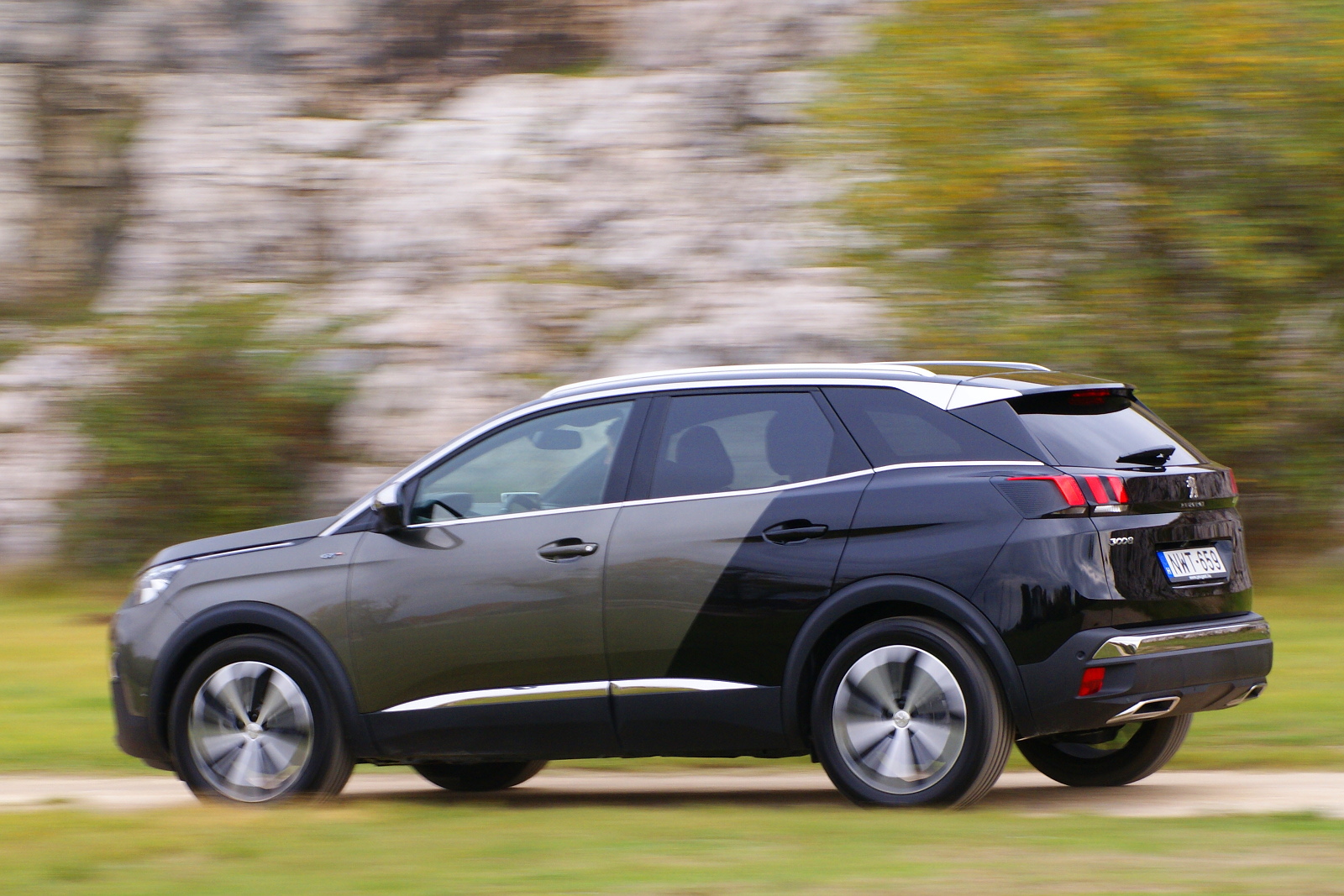 Egy rövid közúti körre sikerült elvinni a 180 lóerős dízelmotorral és automatikus váltóval szerelt GT csúcsmodellt, a csak itt elérhető kétszínű fényezéssel, ahol nem csak a tető kap fekete fényezést, de a hátsó ajtó közepétől kezdve a karosszéria többi része is. Jól néz ki, hogy az egyébként fekete betétbe rejtett hátsó macskakarom hátsó lámpák így még jobban belesimulnak a környezetbe. A vezetőülésben helyet foglalva óriásnak érzi magát az ember, a kis átmérőjű kormánykerék kifejezetten mélyen van, felülről nézek rá nemcsak a műszerfalra, de a motorháztetőre is. Alul és felül is kiegyenesítették a volán karimáját, egyébként jó fogású a perforált bőrrel és díszvarrással ékesített GT-kormány, de elég érzékeny, úgyhogy nem árt óvatosan forgatni. Márpedig sok dolga lesz vele a vezetőnek, ha nem csak autópályán közlekedik vele, de mondjuk megpróbál a magyar mellékutakon közlekedni: patttog az úton a 3008-as, még egyenesben is le akar esni az aszfaltról.
