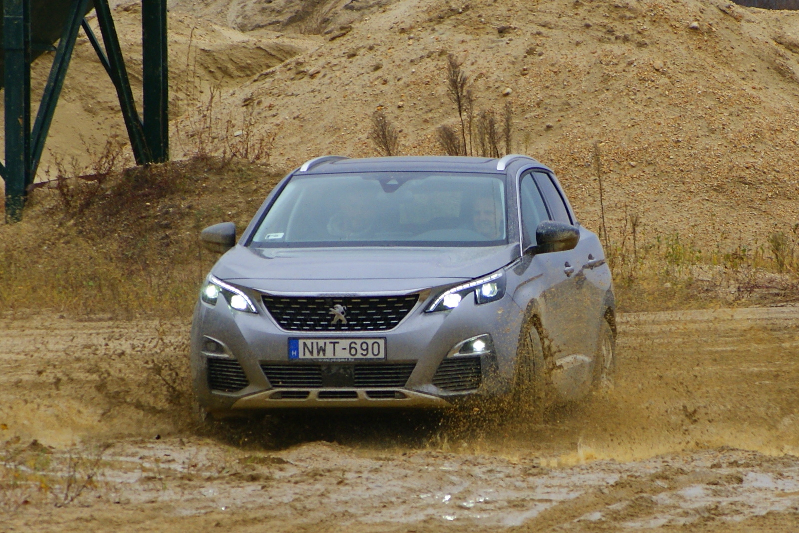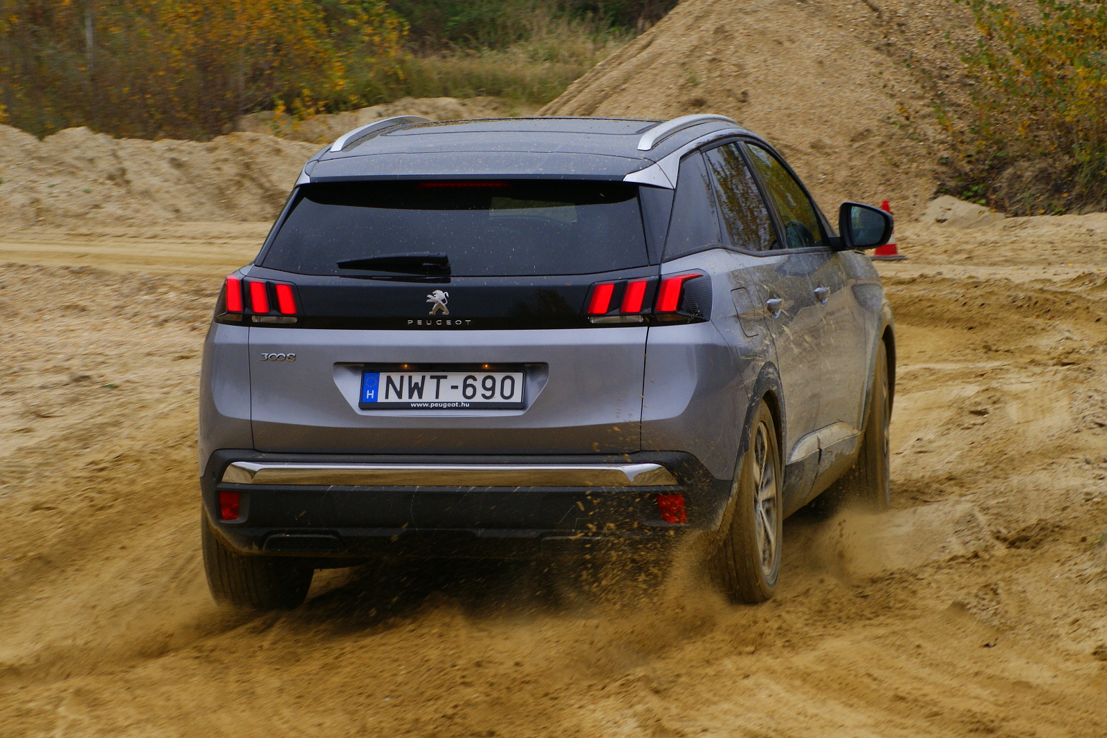 Egy-két rövid kör erejéig egy homokbányában is kipróbálhattuk, mennyire lett igazi szabadidő-autó az újdonság. Hiába a 20 fokos első, 29 fokos hátsó terepszög és a 22 centis hasmagasság, az elsőkerékhajtás miatt igazán komoly terepre nem ajánlott menni a 3008-assal – valamikor 2018 második felében jön a hálózatról tölthető benzin-elektromos hibrid modell, amely virtuális összkerékhajtást kap. Bekapcsolt menetstabilizálóval is (rossz út fokozat a Grip Control forgókapcsolón) jól mozog, de ilyenkor érezhetően visszafogja a kerekeket az elektronika, igaz, néha hagyja kipörögni azokat. Utóbbi szinte folyamatos, ha teljesen megszabadulok az elektronikus felügyelettől a forgókapcsoló továbbtekerésével. Látványos fotók készítésére alkalmas ez a kör, egyébként túl sokat nem tudok meg belőle az új autó tulajdonságaiból.