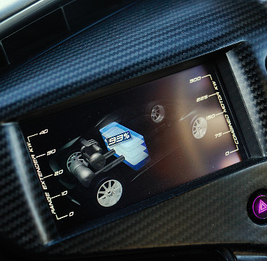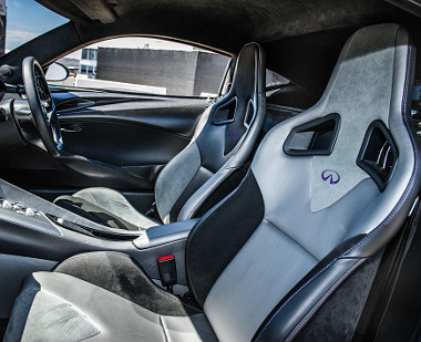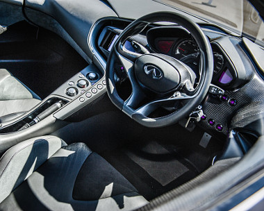 A „derékmagasságú” Emerg-E felé sétálva nemcsak a tiszteletet parancsoló teljesítmény, hanem a tanulmányautó pénzben nehezen kifejezhető értéke miatt is izgultam. Koncepcióautós mércével a kétszemélyes pilótafülke kidolgozása tisztességes, helyenként láttatni engedték a karbonfelületeket, másutt Infiniti-lila cérnával varrott alcantara és bőr borít mindent. Némelyik kapcsoló és kezelőszerv viszont mintha egy Nissan kisautóból származna, és a műszeregység is inkább egyszerű, semmint futurisztikus.
