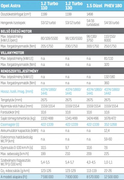Ötajtósként kezd, majd nem sokkal később kombiként is megvásárolható lesz az Opel Astra L, 2023 tavaszán a 225 lóerő rendszerteljesítményű plug-in változat koronázza meg a kínálatot. 2024 elején akkumulátoros-elektromos hajtással is elérhető lesz a típus.