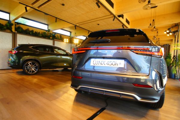 Egy öntöltő hibrid hajtású NX 350h-t és egy F Sport felszereltségű, hálózatról tölthető hibrid hajtással szerelt NX 450h+-t nézhettünk, tapogathattunk meg. Az egymás mellett álló két autót nézve lehet csak felfedezni, hogy például a két első lökhárító ugyanaz, csak az immár függőlegesen álló hűtőrács betétje és a körítés (légbeömlő körüli dísz mérete, alsó toldat) tér el. Mindkét autóban a nagyobb, 14 colos képátlójú központi érintőképernyő volt, ezt egyébként elérhető közelségbe hozták, és megszabadultak a tapipadtól; ha tényleg olyan jó a hangvezérlés magyarul, ahogy azt állítják, ezt senki nem fogja hiányolni.